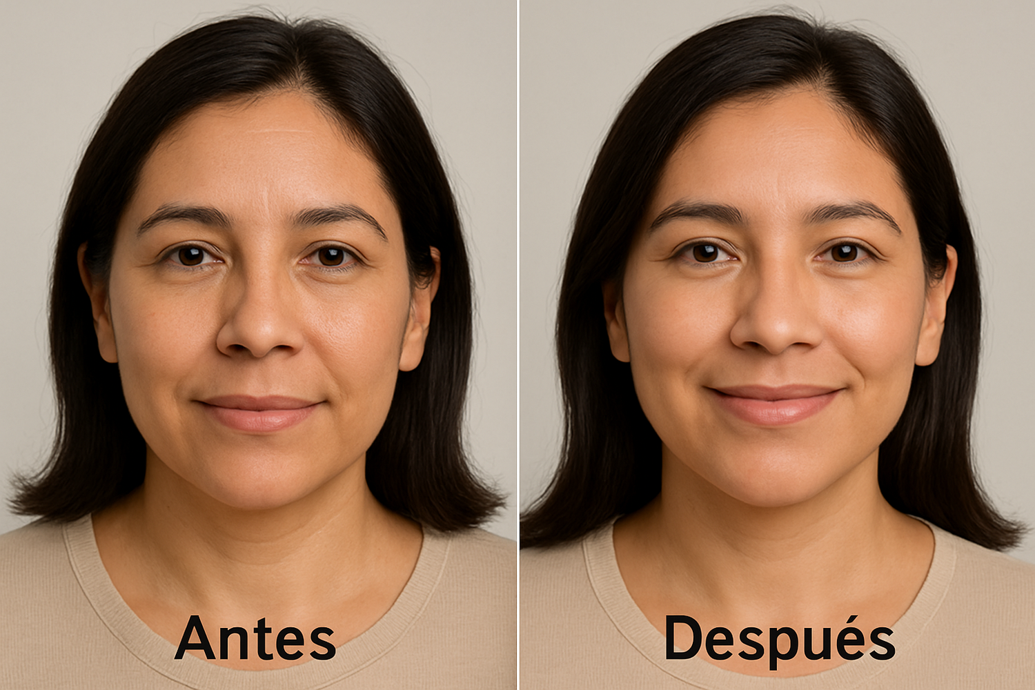 La fórmula Suaviza la apariencia de líneas finas y contornos gracias a su hidratación profunda, niacinamida (mejora textura y tono) y colágeno (aspecto más firme). El resultado es un “efecto botox sin agujas” visible en la luminosidad y tersura de la piel. No reemplaza procedimientos médicos/